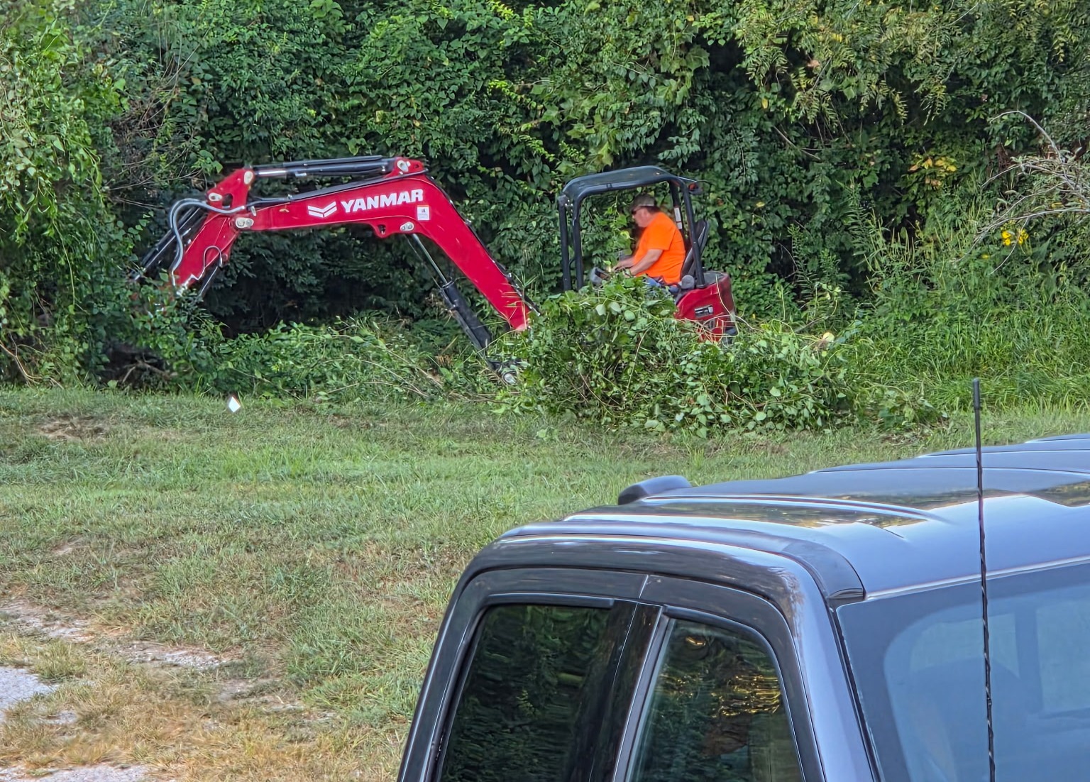 Cleaned out the creek, some of the fence line, and the entrances to the driveway and the barns. The excavator ripped the stuff out and the Kubota hauled it to the piles.