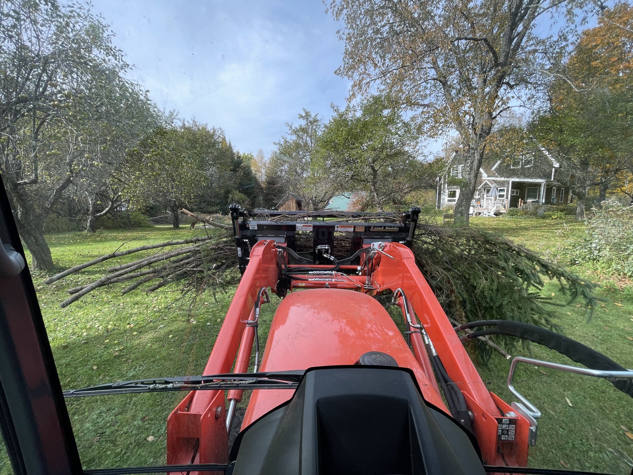 Told my wife and Dad to stay off the road for about 30 minutes and I’d text them when all was clear. Put a rope and snatch block about 20’ up the trunk, notched it to fall away from the driveway, started to pull on it from a perfectly safe distance to put just a little pressure on it before back cutting. Before back cutting, I shut off the saw and checked the rigging now that it was snug to make sure nothing was in a bind and all was right with it. So of course my Dad comes up from his end of the road on his four wheeler, wife comes down from our end of the road on the Mule and they start an impromptu conference in the road under the tree. Tell my wife the tree ain’t down yet so please park anywhere else on the planet. She knows what tree I’m cutting so she looks at it, realizes her error and moves. Dad decides it’s a good time to heckle me. Wants to know why I’m taking down a perfectly healthy tree and why I need the tractor to do it other than an excuse to use the tractor. If it falls across the driveway, he’ll just whack it off with limb loppers and throw it out of the way. Back in the day he didn’t cut healthy trees for no reason and he didn’t need a grapple on a fancy tractor to move a 3” tree. We then clarify I’m not cutting that tree, I’m cutting THAT tree. He hadn’t notice THAT tree as it wasn’t all that obvious from the road, so he moved without further comment and later thanked me for taking it down. They’re not normally like that. It should have been a sign but there was no stopping at that point anyway.