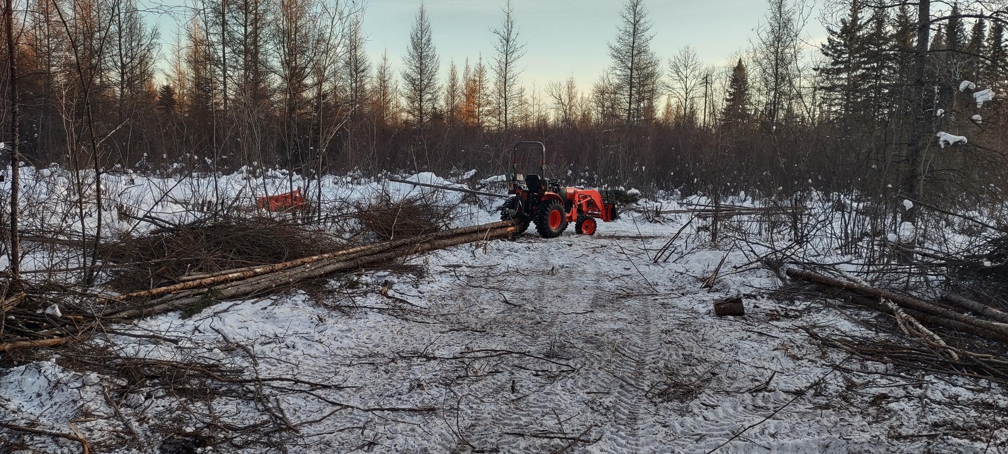 I do like that dump trailer. I wanna get one, but can't really justify the expense versus more important needs/wants. Me and the Missus could go to Australia for a month for what one of those buggers costs. I'll give ya three guesses which she'd rather have, and the first two don't count.Getting low on firewood so used the tank to pull the smaller PJ dump trailer up into the woods to get some downed trees. It was a beautiful day Saturday but I ran out of daylight so left the trailer in the trees and finished up yesterday afternoon.