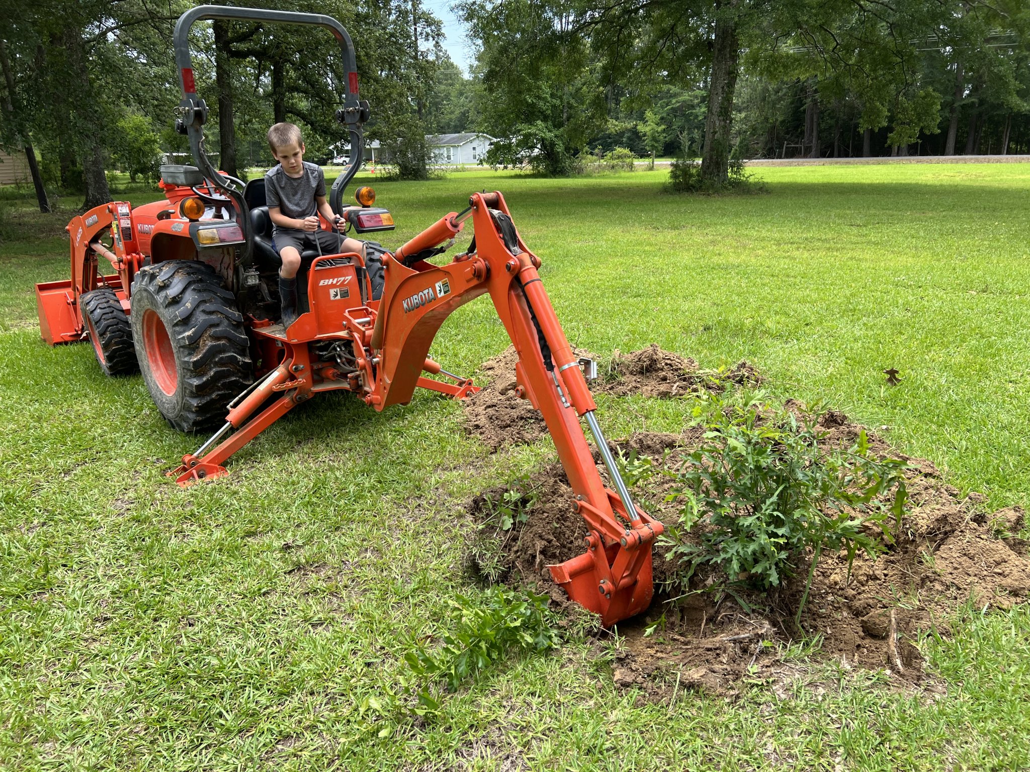 Kids can be amazing, there is a place outside of Houston, TX that has small equipment that they rent out mini equpment for kids that are 3 years and up. It's like a big sandbox for kids and it's surprising how quickly they learn and how good they are running stuff. Don't know if it's up and running, but there was a place that used that same concept, except it was for adults running full sized equipment.While we had the hoe on yesterday we dug up a stump in the front.