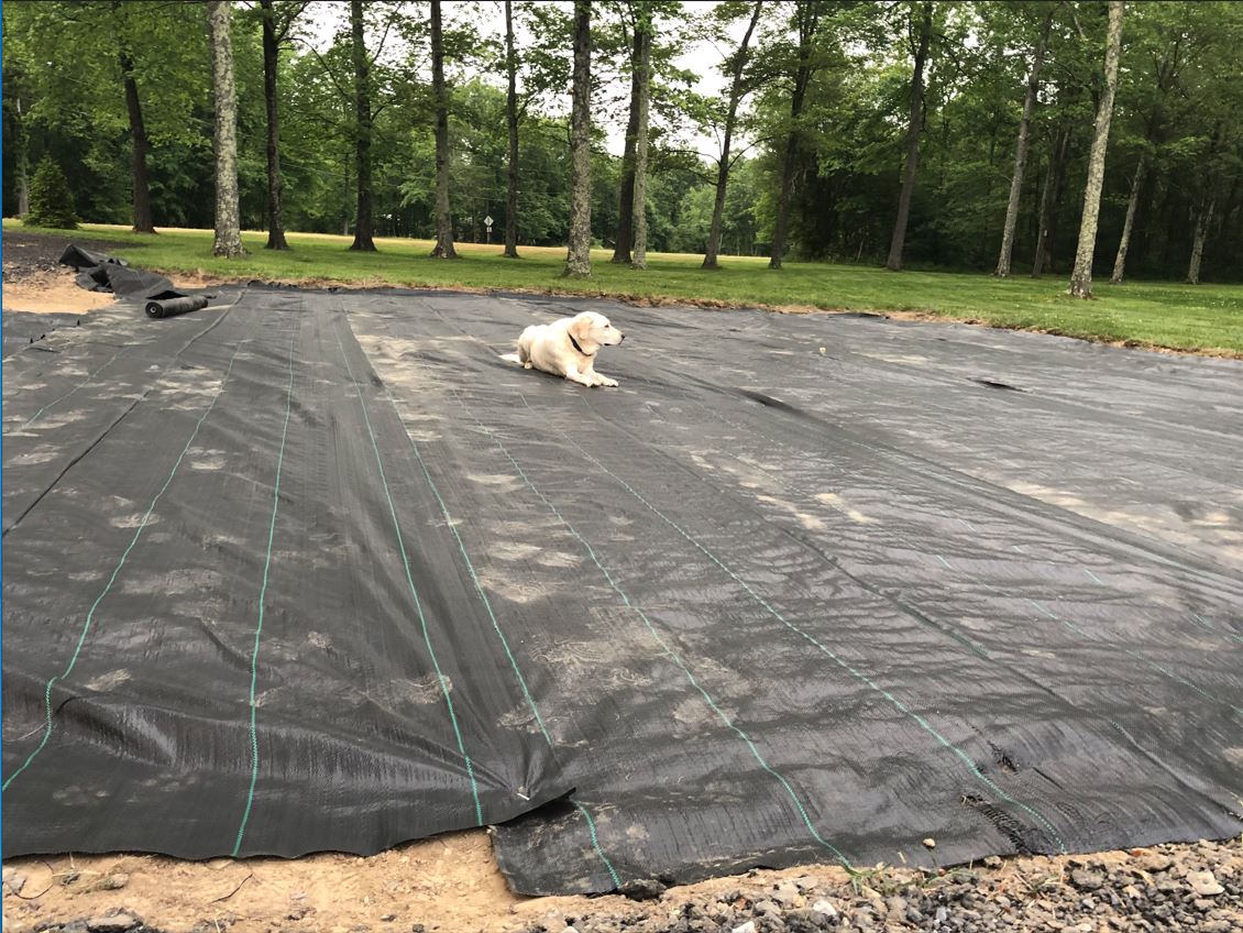 Installation of road fabric with assistance from my favorite helper (and chief inspector):