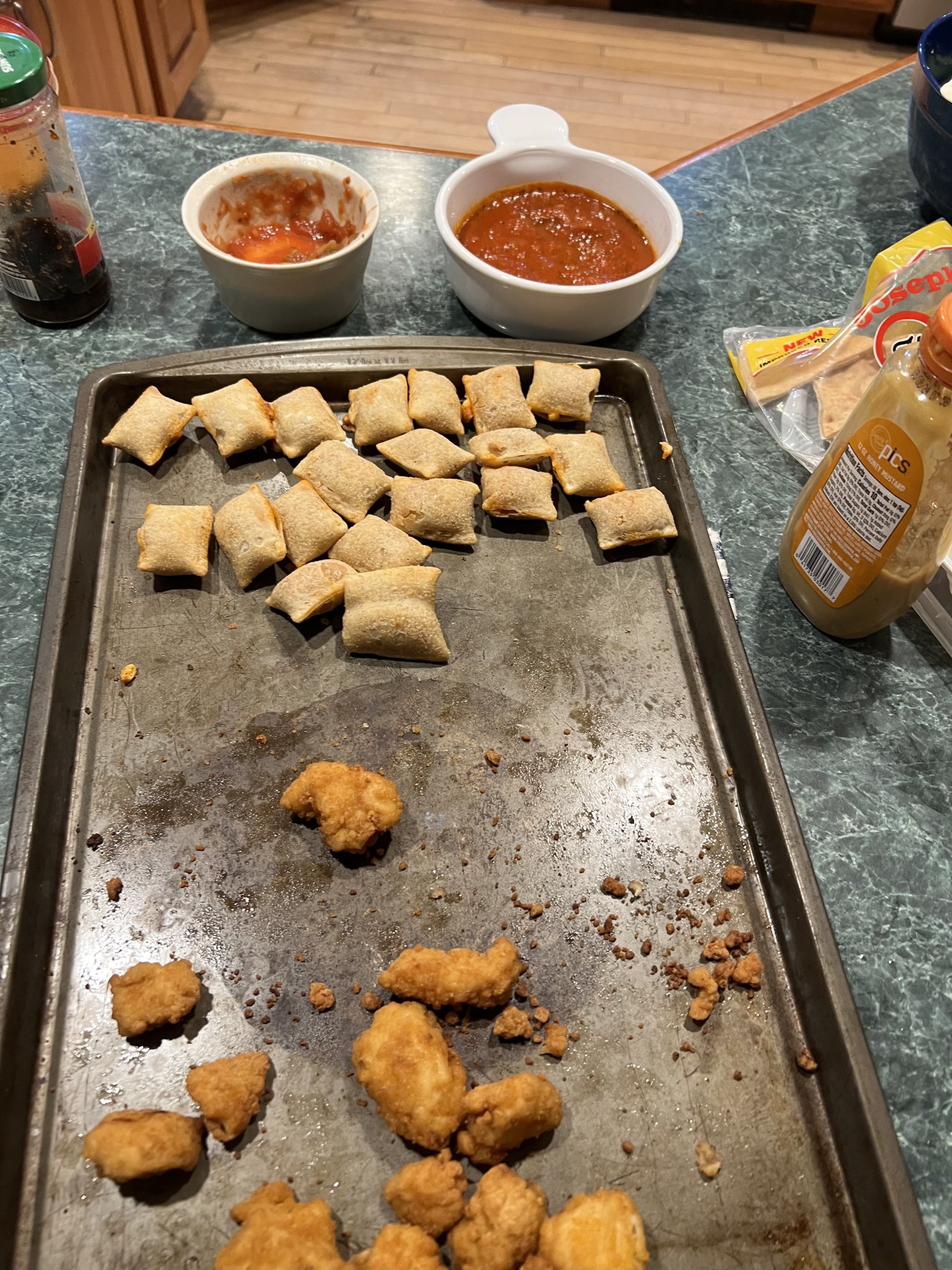 Probably was the prepared stuff we had for snacks…..chicken chunks and pizza rolls.